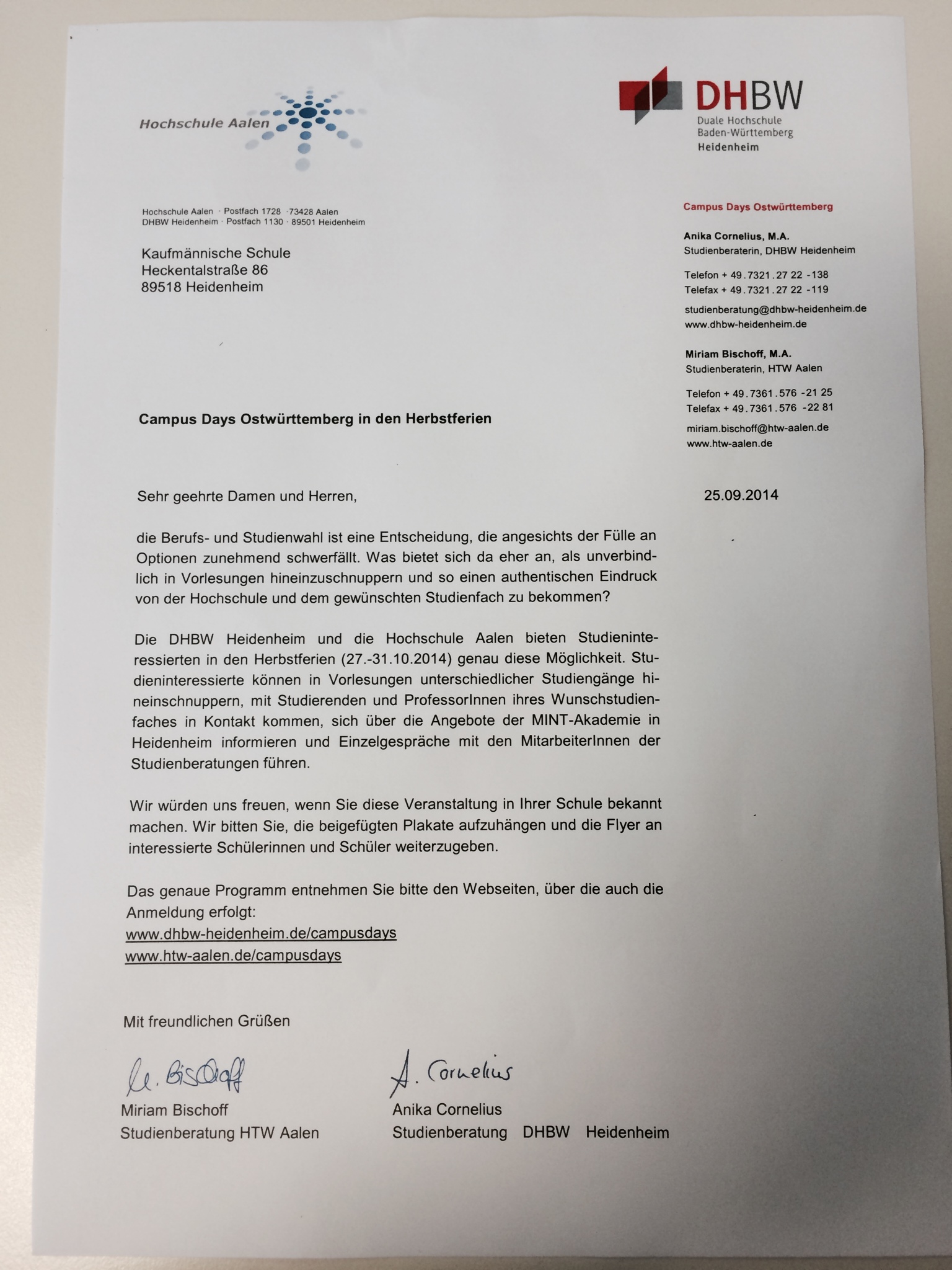 Kaufmännische Schule Heidenheim > Hochschulinfos > Hochschule Aalen und DHBW 27.-31.10.14
