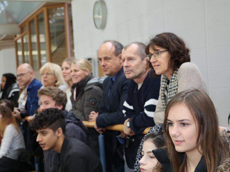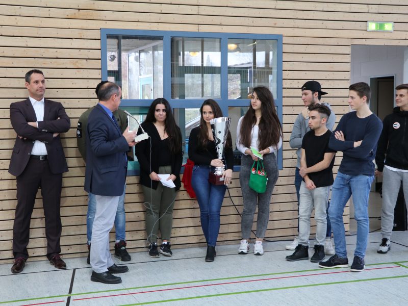 Zur anschließenden Siegerehrung und Pokalübergabe hielten die Schülersprecherin Assia Cappiello, Schulleiter Stefan Bader und der Vertreter der Kreissparkasse Claus Burkhardt kurze Ansprachen und gratulierten den erfolgreichen Spielern. Nach der Ehrung der Drittplatzierten – WGJ2/2 – und der zweiten Sieger – die Lehrermannschaft – bekamen die Sieger den Pokal und von der Kreissparkasse gestiftete Sachpreise. Der Pokal hat nun bis zu den Sommerferien einen Ehrenplatz im Klassenzimmer des Berufskollegs FH.