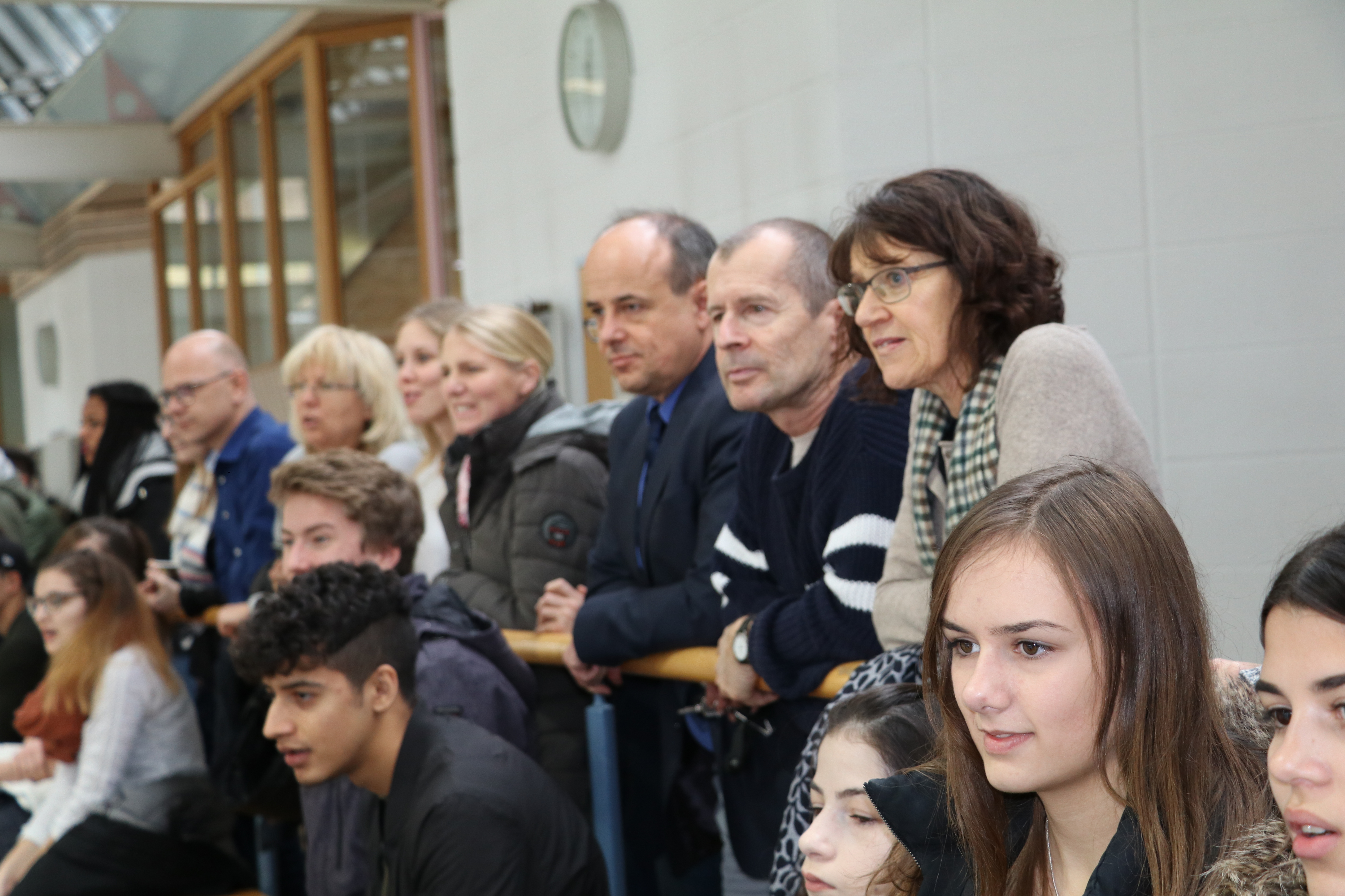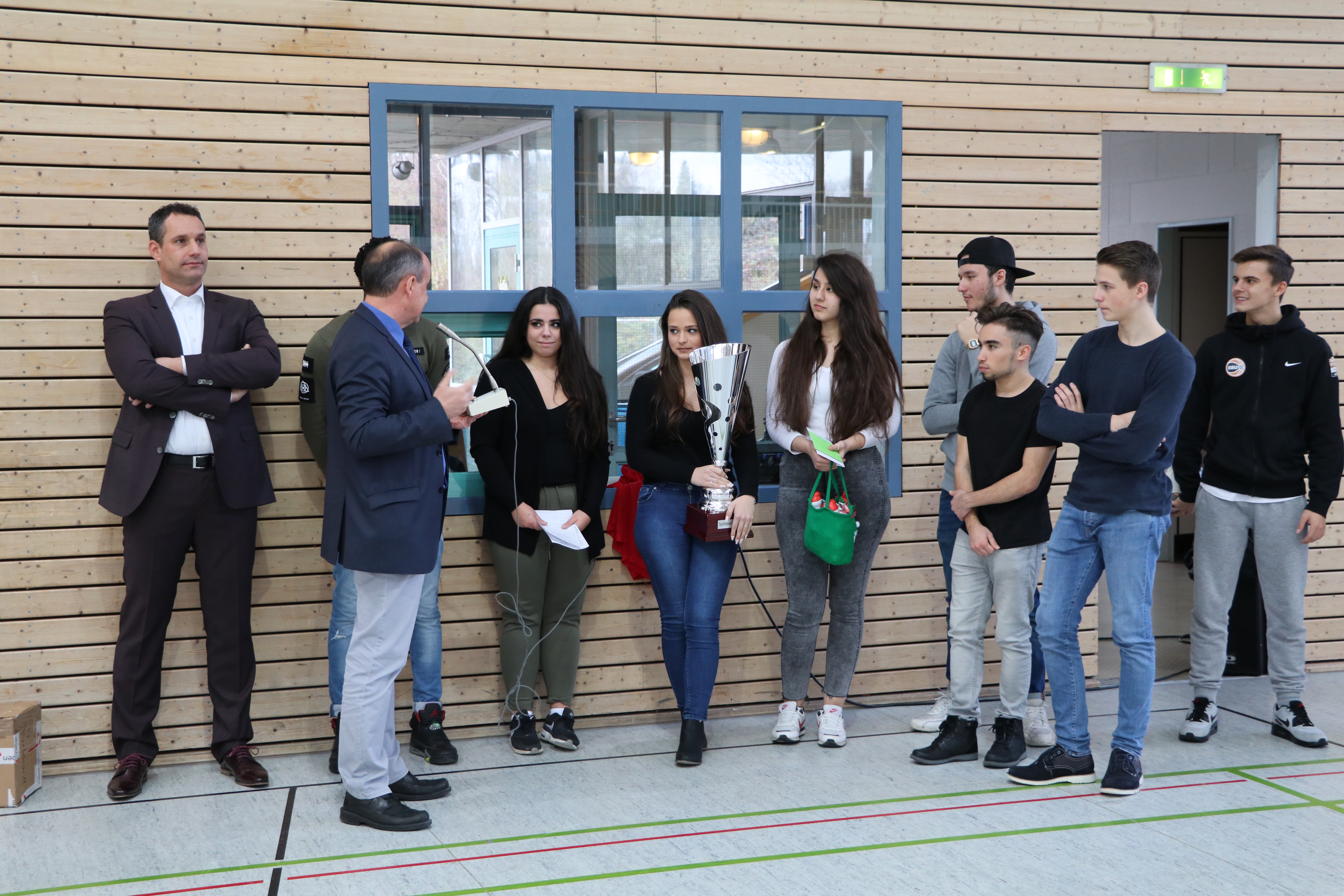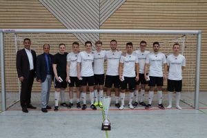 Zur anschließenden Siegerehrung und Pokalübergabe hielten die Schülersprecherin Assia Cappiello, Schulleiter Stefan Bader und der Vertreter der Kreissparkasse Claus Burkhardt kurze Ansprachen und gratulierten den erfolgreichen Spielern. Nach der Ehrung der Drittplatzierten – WGJ2/2 – und der zweiten Sieger – die Lehrermannschaft – bekamen die Sieger den Pokal und von der Kreissparkasse gestiftete Sachpreise. Der Pokal hat nun bis zu den Sommerferien einen Ehrenplatz im Klassenzimmer des Berufskollegs FH.